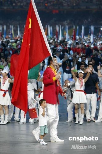 8月8日,第29屆夏季奧運(yùn)會(huì)在北京奧林匹克公園內(nèi)的國(guó)家體育場(chǎng)“鳥(niǎo)巢”舉行。中國(guó)代表團(tuán)的旗手是著名籃球運(yùn)動(dòng)員姚明,走在姚明身邊的是獲得英雄少年的光榮稱(chēng)號(hào)的四川省阿壩州映秀鎮(zhèn)漁子溪小學(xué)二年級(jí)學(xué)生林浩。中國(guó)體育代表團(tuán)派出了1099人的龐大陣容,將參加全部28個(gè)大項(xiàng)的比賽。中新社發(fā) 杜洋 攝