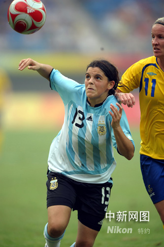 8月9日,奧運阿根廷女足在天津奧體中心水滴體育場對陣瑞典隊。圖為阿根廷女足13號隊員瑪麗亞·奎諾尼斯在進(jìn)攻。中新社記者 陳文 攝