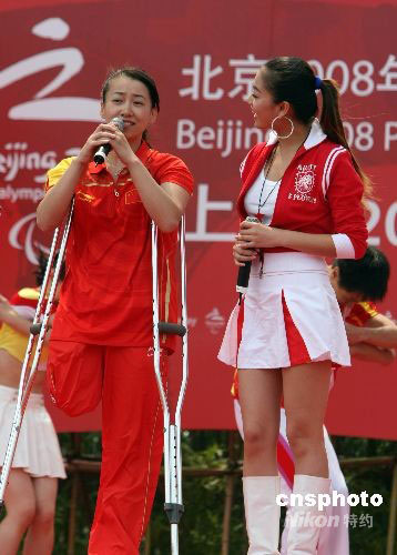 九月一日,北京殘奧會(huì)助威團(tuán)形象大使金晶(左),在上海助陣殘奧會(huì)火炬接力活動(dòng)。當(dāng)日,北京殘奧會(huì)火炬接力“時(shí)代風(fēng)采線(xiàn)”第三站傳遞活動(dòng),在上海松江新城大學(xué)園區(qū)進(jìn)行,共有六十名火炬手參加。其中,殘疾人員有10名,其余為助殘、幫殘的先進(jìn)代表和基層殘疾人事業(yè)工作者。中新社發(fā) 湯彥俊 攝