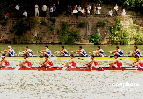 9月1日,2008海峽兩岸高校賽艇龍巖邀請(qǐng)賽在福建省龍巖上杭水上運(yùn)動(dòng)中心舉行。來(lái)自北京大學(xué)、清華大學(xué)、臺(tái)灣輔仁大學(xué)、香港中文大學(xué)賽艇隊(duì),參加男子八人單槳有舵手賽艇競(jìng)賽項(xiàng)目角逐。經(jīng)過(guò)激烈爭(zhēng)奪,清華大學(xué)、北京大學(xué)、臺(tái)灣輔仁大學(xué)、香港中文大學(xué)賽艇隊(duì)分獲前四名。中新社發(fā) 劉可耕 攝