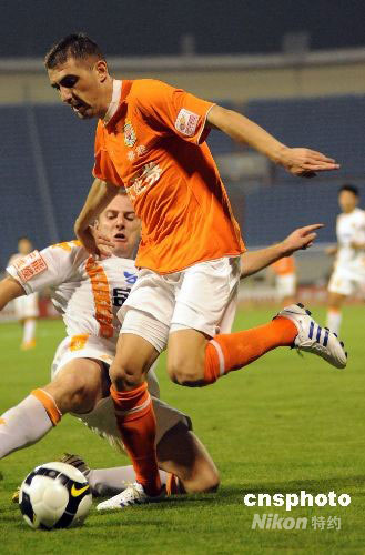 2008年9月7日,中國足球超級聯(lián)賽第9輪在山東濟南的一場比賽,主場作戰(zhàn)的山東魯能泰山隊以2比1戰(zhàn)勝青島盛文中能隊。中新社發(fā) 張侃 攝