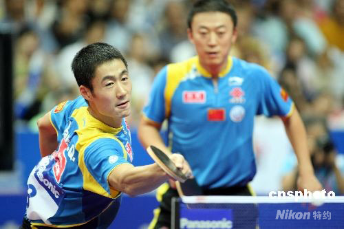 9月14日,2008年國際乒聯(lián)職業(yè)巡回賽中國乒乓球公開賽在上海舉行,中國選手王勵(lì)勤(左)與馬琳在男子雙打決賽中,以4:3戰(zhàn)勝隊(duì)友王皓與陳玘獲得冠軍。中新社發(fā) 湯彥俊 攝