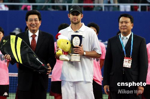 9月28日,在2008年中國網(wǎng)球公開賽男單冠亞軍爭奪戰(zhàn)中,美國帥哥羅迪克以6-4/6-7(5)/6-3艱難擊敗本周持續(xù)有出色表現(xiàn)的以色列黑馬D·塞拉,奪得冠軍。這也是他本賽季繼2月圣何塞以及3月迪拜之后第三次奪得巡回賽單打冠軍,同時亦是個人職業(yè)生涯的第26個單打冠軍。 中新社發(fā) 富田 攝