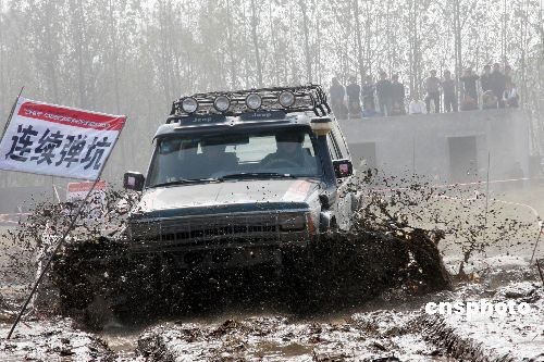 10月17日,2008華東地區(qū)汽車場(chǎng)地越野邀請(qǐng)賽決賽在安徽淮北市舉行。比賽分為男子、女子兩個(gè)組別,賽場(chǎng)設(shè)計(jì)了包括炮彈坑、深水池、蹺蹺板、沼澤地等18個(gè)障礙,來自華東地區(qū)百余頂尖車手、近60輛賽車齊聚淮北,各施絕技。中新社發(fā) 萬善朝 攝