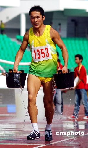 十月三十日,第六屆全國農(nóng)民運(yùn)動(dòng)會(huì)田徑比賽在福建泉州海峽體育中心拉開帷幕后,進(jìn)行了男子5分鐘50米抗旱提水保苗賽跑比賽,這是一項(xiàng)考驗(yàn)運(yùn)動(dòng)員耐力和技巧的項(xiàng)目,最后一分鐘,是運(yùn)動(dòng)員體力的大考驗(yàn)。中新社發(fā) 傅丹丹 攝
