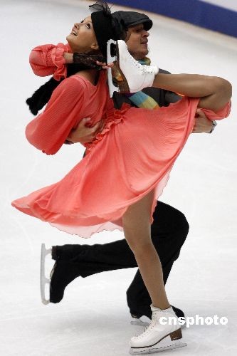11月7日,2008中國杯世界花樣滑冰大獎(jiǎng)賽在北京首都體育館進(jìn)行第二天的爭奪,俄羅斯組合多姆尼娜、沙巴林在冰舞創(chuàng)編舞比賽后,以95.58的成績繼續(xù)排在參賽的十對選手之首。中新社發(fā) 盛佳鵬 攝