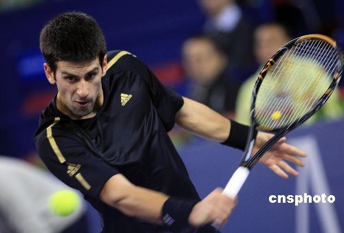 11月9日,2008年上海網(wǎng)球大師杯在上海旗忠網(wǎng)球中心拉開戰(zhàn)幕。在當(dāng)日進(jìn)行的金組首場比賽中,塞爾維亞小天王德約科維奇以2比0戰(zhàn)勝阿根廷選手德爾波特羅,迎來自己在上海網(wǎng)球大師杯上的首場勝利。去年,德約科維奇首次亮相上海網(wǎng)球大師杯,小組賽3戰(zhàn)盡墨。中新社發(fā) 湯彥俊 攝