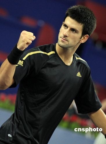 11月11日,在上海旗忠網(wǎng)球中心進行的上海大師杯單打金組第二輪的一場焦點戰(zhàn)中,世界排名第三位的塞爾維亞選手德約科維奇以2比1戰(zhàn)勝俄羅斯“勞!边_維登科。3盤比分是7-6(3)/0-6/7-5。中新社發(fā) 湯彥俊 攝