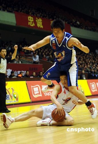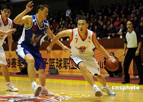 2008年11月16日,2008-2009CBA聯(lián)賽常規(guī)賽首輪在山東濟(jì)南的比賽中,主場作戰(zhàn)的山東黃金男籃以94-74戰(zhàn)勝天津榮鋼男籃,取得開門紅。中新社發(fā) 張侃 攝