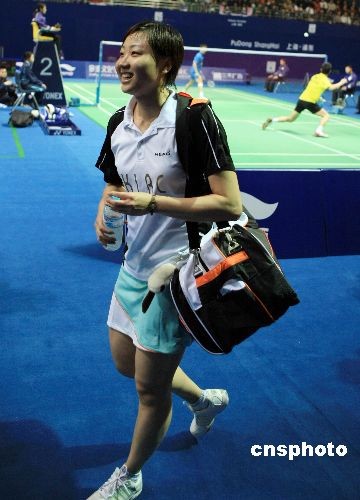 11月21日,在上海進行的2008年中國羽毛球公開賽女子單打1/4決賽中,現(xiàn)世界排名第一、香港選手周蜜以0比2不敵中國小將朱晶晶,無緣四強。中新社發(fā) 湯彥俊 攝