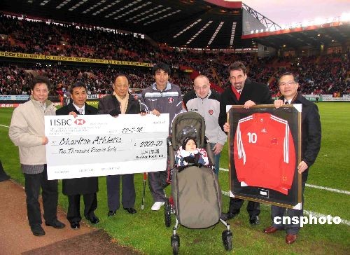 當(dāng)?shù)貢r間11月22日下午,倫敦,英冠聯(lián)賽第18輪,查爾頓主場迎戰(zhàn)謝菲爾德聯(lián)隊。中場休息之際,查爾頓隊中國球員鄭智(左四)現(xiàn)場貢獻(xiàn)出一件親筆簽名的在中國國家隊所披10號戰(zhàn)袍,拍賣所得款項為一位殘疾小球迷購買高級輪椅。英國泗和行集團(tuán)老板謝貴全(左三)當(dāng)場慷慨解囊兩千英鎊,拍得該件球衣。中新社發(fā) 楊冉 攝