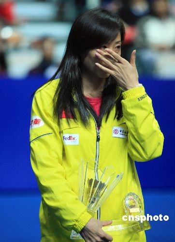 圖為雅典奧運、北京奧運女單冠軍張寧揮淚告別羽壇。