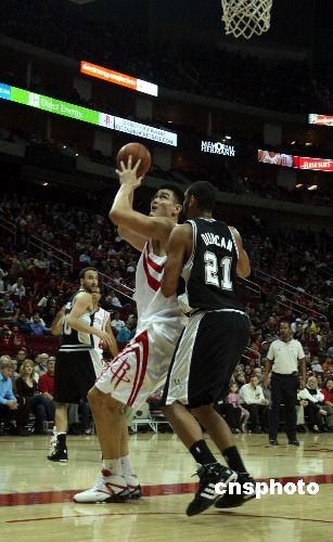 當(dāng)?shù)貢r(shí)間11月29日晚,火箭在主場(chǎng)以103-84大勝馬刺,成為西南區(qū)的領(lǐng)頭羊;鸺装l(fā)五虎得分都上雙,姚明打了27分鐘,拿下12分,但只搶1個(gè)籃板,蓋帽3次。中新社發(fā) 歐文 攝
