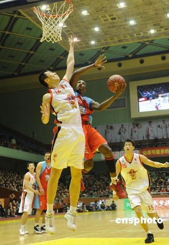 11月30日,2008-2009CBA聯(lián)賽常規(guī)賽第7輪比賽在山東濟(jì)南的比賽中,主場(chǎng)作戰(zhàn)的山東黃金男籃96:106不敵新疆廣匯男籃。中新社發(fā) 張侃 攝