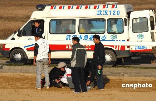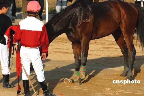 11月30日,在湖北武漢市“東方馬城”舉行的2008年全國速度賽馬錦標(biāo)賽上,2600米沙地?zé)o限定馬決賽第二組在比賽時(shí),發(fā)生賽馬“追尾”驚險(xiǎn)一幕。在跑到第二圈進(jìn)入最后全力沖刺時(shí),新疆隊(duì)唐旭駕馭的7號(hào)馬“巴黎之眼”避讓不及北京隊(duì)魏云忠駕馭的10號(hào)馬“賽速”,兩馬重重地撞在一起,“巴黎之眼”當(dāng)場(chǎng)被撞暈倒地不醒,“賽速”右前蹄則被撞斷受傷嚴(yán)重,所幸兩名運(yùn)動(dòng)員均無大礙。據(jù)業(yè)內(nèi)人士介紹,賽馬運(yùn)動(dòng)屬于高風(fēng)險(xiǎn)運(yùn)動(dòng),運(yùn)動(dòng)員和馬匹在激烈的比賽過程中,都有出現(xiàn)意外的可能。中新社發(fā) 楚天行 攝