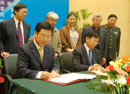 10月27日,由大連市人民政府申辦,經(jīng)中國(guó)文聯(lián)、中國(guó)電影家協(xié)會(huì)考察決定,第17屆中國(guó)金雞百花電影節(jié)將于2008年9月在大連市舉行。圖為大連市代表和中國(guó)電影家協(xié)會(huì)代表簽約。中新社發(fā) 邱勇 攝