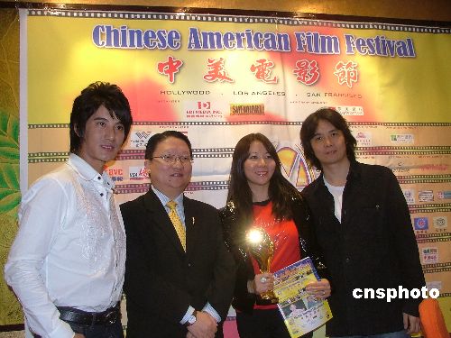 為期9天、在洛杉磯、舊金山兩地?zé)狒[登場的“中美電影節(jié)”接近尾聲。11月7日,中美電影節(jié)組委會主席蘇彥韜把“金天使”獎杯頒給獲得十佳電影:《喜馬拉雅王子》(Prince of Himalayas)導(dǎo)演胡雪樺、制片人胡雪蓮、男主角蒲巴甲,并共同見證洛杉磯、舊金山兩地郵政管理局所發(fā)行的中美電影節(jié)開幕式紀(jì)念首日封。 中新社發(fā) 盧威 攝