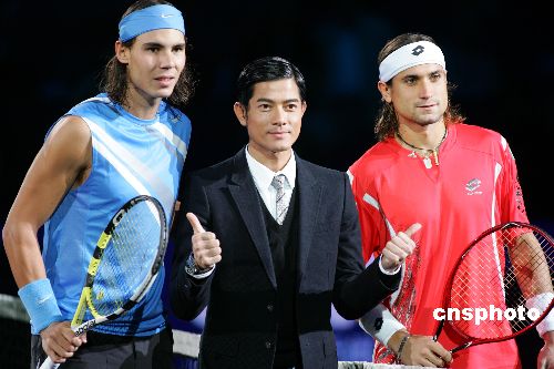 11月13日,香港藝人郭富城在上海“執(zhí)法”網(wǎng)球大師杯,為西班牙“德比”——拉斐爾·納達(dá)爾與大衛(wèi)·費(fèi)雷兒的比賽“挑邊”。圖為郭富城(圖中)與納達(dá)爾(圖左)費(fèi)雷兒(圖右)在賽場合影。中新社發(fā) 湯彥俊 攝
