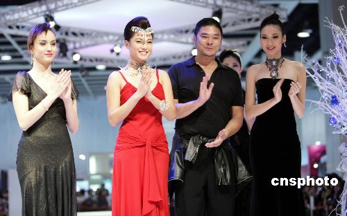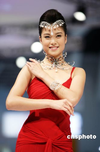 12月7日,明星廖碧兒在香港會展中心舉行的“香港國際珠寶展”上,穿著形象顧問鄧達(dá)智設(shè)計的服飾,演繹最受買家歡迎的首飾設(shè)計比賽得獎作品。中新社發(fā) 洪少葵 攝