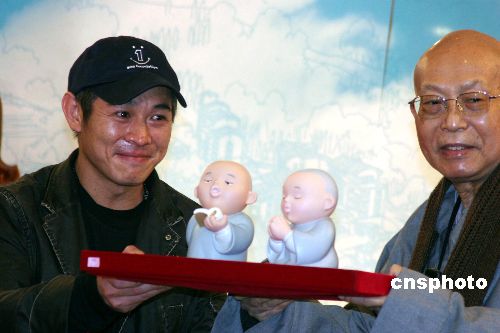 十二月十六日,為宣傳新片《投名狀》先期抵臺(tái)的武打巨星李連杰,在臺(tái)北拜會(huì)法鼓山創(chuàng)辦人圣嚴(yán)法師,并贈(zèng)送二百?gòu)堧娪捌,支持興建法鼓大學(xué)。圖為李連杰(左)接受圣嚴(yán)法師回贈(zèng)的兩只“慈悲小沙彌”。中新社發(fā) 董會(huì)峰 攝