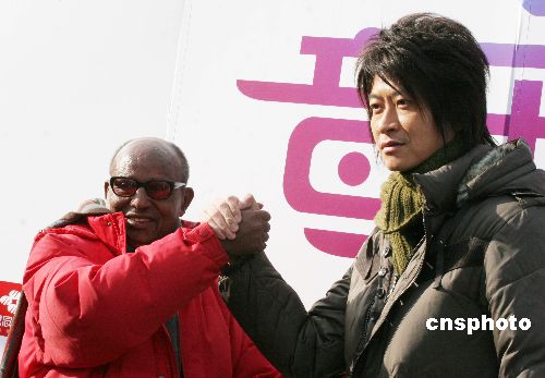 2008年1月2日下午,在北京林業(yè)大學(xué)體育場里,臺灣歌手游鴻明同坦桑尼亞奧運英雄阿赫瓦里共同完成奧運歌曲音樂電視《英雄》的場景拍攝。 中新社發(fā) 博芽影像 攝