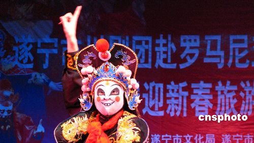 1月15日至30日,四川省遂寧市川劇團(tuán)將應(yīng)旅羅華商聯(lián)合會(huì)邀請(qǐng),代表中國(guó)到羅馬尼亞作文化交流演出。據(jù)悉,這次赴羅馬尼亞文化交流演出,遂寧市川劇團(tuán)共被選中《茶藝》、《手影》、《變臉吐火》、《川劇集錦》、川劇精品戲《鐘馗嫁妹》、《獅舞》等6個(gè)精品節(jié)目參演。首場(chǎng)演出在羅馬尼亞皇家歌舞劇院舉行。屆時(shí),將有50余個(gè)國(guó)家的駐羅使節(jié)到場(chǎng)觀看。圖為四川省遂寧市川劇團(tuán)演員在演出精品川劇節(jié)目。中新社發(fā) 鐘敏 攝