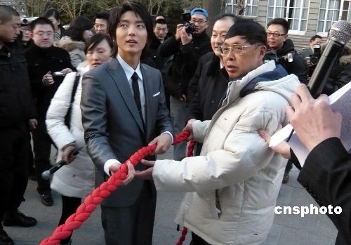1月13日,愛浪(國際)文化產(chǎn)業(yè)集團與韓國COMA公司在北京中國人民對外友好協(xié)會舉行締結(jié)聯(lián)盟簽約儀式,雙方將在多個文化項目上進行合作,圖為在簽約儀式前中國人民對外友好協(xié)會會長陳昊蘇與“中韓文化交流大使”韓國人氣偶像李俊基等一起敲響“和平友誼鐘”。中新社發(fā) 錢興強 攝