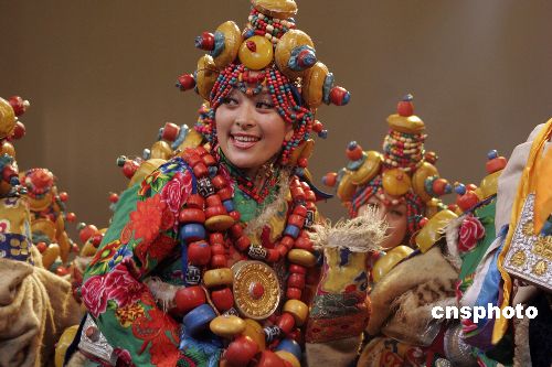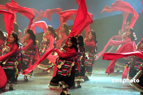 2008年1月21日,著名舞蹈家楊麗萍攜《藏謎》在?谌嗣翊髸蒙涎。《藏謎》以藏族老阿媽虔誠的朝拜路途中所見為主線,表現(xiàn)了藏區(qū)牧民生活、民間習(xí)俗、宗教儀式場景。主創(chuàng)人員用了1年多的時間,行走在藏、青、川、云等各省區(qū)的20多個藏區(qū),大量收集了音樂、舞蹈、器樂、服裝等作為原始創(chuàng)作素材。劇中8成以上的演員都是藏區(qū)的牧民,完全是原生態(tài)的演出。中新社發(fā) 尹恩彪 攝