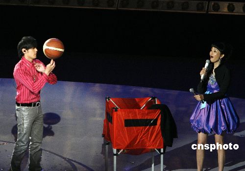 2008年1月21日,北京2008年奧運會歌曲宣傳推廣啟動晚會在北京奧林匹克籃球館舉行,歌手們傾情演出,用各自的歌聲為奧運造勢,周杰倫更是在現(xiàn)場進(jìn)行灌籃表演。這是竣工后的北京奧林匹克籃球館首次舉辦大型活動。中新社發(fā) 魯谷 攝