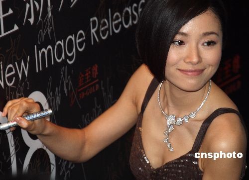 2月28日晚,香港紅星陳慧琳佩戴著價(jià)值千萬的珠寶,在北京舉行的香港“金至尊珠寶”2008新形象發(fā)布會(huì)上亮相。同時(shí)亮相的還有藝人張恒、唐嫣、高露、江一燕、丁柳元、陳虹池以及名模春曉等。中新社發(fā) 錢興強(qiáng) 攝