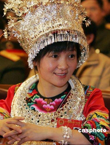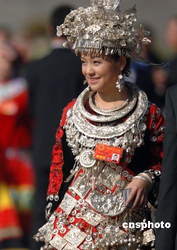 來自貴州的苗族全國人大代表雷阿幼朵,盛裝出席在北京人民大會(huì)堂舉行的十一屆全國人大一次會(huì)議預(yù)備會(huì)。中新社發(fā) 王東明 攝