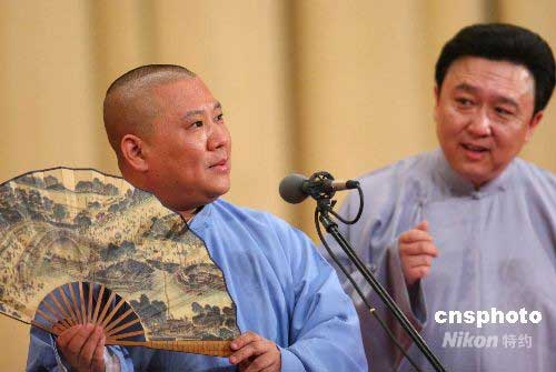 5月3日,紀念著名相聲大師侯寶林先生誕辰九十周年暨德云社相聲精品晚會,在北京人民大會堂舉行,當紅相聲演員郭德綱率領德云社成員侯震、于謙、何云偉、曹云金、李菁等為觀眾獻上了一場精彩的演出。全場所有段落都是在侯寶林先生原作的基礎上稍加修改而成,這其中包括了《賣布頭》、《戲曲與方言》、《歪批三國》等經(jīng)典段子。中新社發(fā) 富田 攝