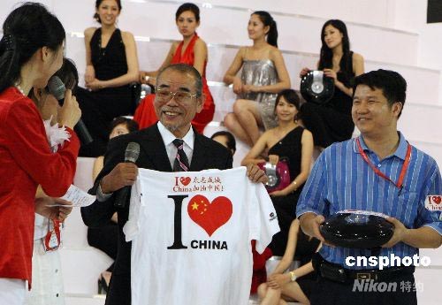 5月30日,在北京舉行的第17屆中國(guó)國(guó)際專(zhuān)業(yè)音響燈光樂(lè)器及技術(shù)展覽會(huì)上,卡拉OK之父井上大佑亮相雷石演出設(shè)備盛會(huì)現(xiàn)場(chǎng),圖為在活動(dòng)上井上大佑參加向中國(guó)四川地震災(zāi)區(qū)賑災(zāi)拍賣(mài)活動(dòng)。中新社發(fā) 錢(qián)興強(qiáng) 攝