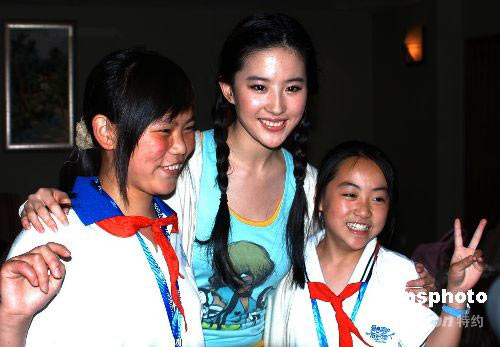 6月2日,89名來自四川北川、彭州、寶興、崇州等地震災區(qū)失去親人的兒童,乘坐南方航空海南分公司的愛心專機抵達海南三亞,進行為期半個月的“愛心呵護、陽光行動”心靈呵護之旅。著名影星劉亦菲當日專程趕到孩子們入住的三亞天域度假酒店看望。中新社發(fā) 尹海明 攝