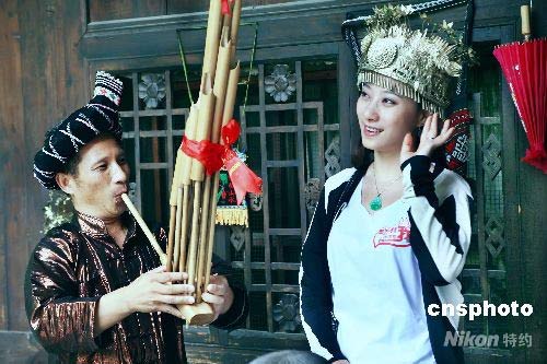瑤族美女歌手米亮從奧運圣火回到祖國的那一刻起,就一路追隨著圣火的腳步,帶著未完成的作品《小夢想》,沿著圣火傳遞的路徑收集聲音和簽名,希望用一首萬人合唱的原創(chuàng)歌曲作為奧運獻禮。在到達江西老區(qū)境內時,正遇四川汶川縣發(fā)生強烈地震。于是,她毫無猶豫的加入到捐款的隊伍,并沿途收集了近千名兒童為災區(qū)小朋友親手制作的祝?ǎ缓笥盅赝巨D送給在各地治療的災區(qū)兒童。被稱為圣火傳遞中救災捐款的最美女孩。 2008年6月8日,米亮追逐圣火到達南寧,她首先做的一件事,就是到廣西區(qū)人民醫(yī)院看望災區(qū)受傷的兒童,并送上祝?。美女米亮,為南寧的景色所傾倒,禁不住換上民族服裝,在南寧留下美好印記。中新社發(fā) 駱文剛 攝