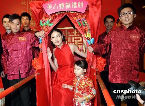 九月三日,某商家特邀即將于十月出嫁的香港歌星陳慧琳穿著裙褂,坐著八人大紅花轎出席新聞發(fā)布會(huì),為活動(dòng)宣傳造勢(shì)。中新社發(fā) 鄧慶樂(lè) 攝