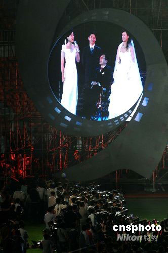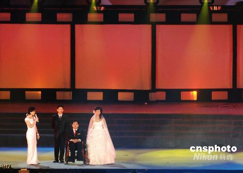 9月10日晚,在遼寧大連市舉行的第17屆金雞百花電影節(jié)開幕式上,高位截癱的大連志愿者、2008年殘奧會火炬手韓偉與女友陶璐舉行現場婚禮,并講述兩人因為電影而結緣的故事。在觀眾的見證下,兩人現場許下愛的誓言,交換婚戒。他們的愛情故事感動了現場的觀眾。影星鄧超為他們送上了自己的祝福。中新社發(fā) 劉德斌 攝