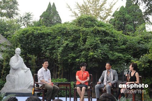 9月16日,《畫(huà)皮》主要演職人員周迅、陳坤、孫儷、戚玉武來(lái)到聊齋故里山東省淄博市淄川區(qū)蒲家莊,舉行《畫(huà)皮》全球首映式。《畫(huà)皮》主題曲《畫(huà)心》的演唱者張靚穎也在現(xiàn)場(chǎng)傾情演繹了這一蕩氣回腸的歌曲。下午4點(diǎn),著名主持人崔永元和《電影傳奇》節(jié)目還專門在蒲松齡故居進(jìn)行了專訪,蒲學(xué)研究專家馬瑞芳現(xiàn)場(chǎng)進(jìn)行點(diǎn)評(píng)。淄博是歷史名著《聊齋志異》作者蒲松齡的故鄉(xiāng),《畫(huà)皮》是其代表作。經(jīng)過(guò)長(zhǎng)達(dá)一年的籌備與拍攝,東方新魔幻巨制《畫(huà)皮》將于9月26日與全國(guó)觀眾見(jiàn)面。中新社發(fā) 閆盛霆 攝