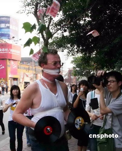 10月17日,來自法國、瑞典、荷蘭、日本、美國、新加坡及中國的20多位藝術(shù)家在重慶上演了一場行為藝術(shù)秀。圖為一荷蘭藝術(shù)家背著掛滿百元大鈔的樹丫,捆綁住自己走上街頭。中新社發(fā) 孟幻 攝
