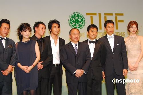 10月18日傍晚,第21屆東京國際電影節(jié)開幕。以“環(huán)保”為主題的本屆電影節(jié)別出心裁地將星光大道的地毯由紅色改為綠色。上個月剛剛當選日本首相的麻生太郎與開幕影片《赤壁》劇組成員同走綠地毯,成為第一個光臨東京國際電影節(jié)現(xiàn)場的日本總理大臣。圖為《赤壁》主創(chuàng)人員在電影節(jié)開幕式上亮相。中新社發(fā) 侯宇 攝