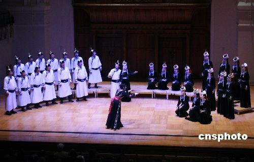 當?shù)貢r間8日晚,內(nèi)蒙古民族歌舞劇院蒙古族青年合唱團在倫敦卡杜甘音樂廳(Cadogan Hall)進行無伴奏合唱演出。中新社發(fā) 李鵬 攝