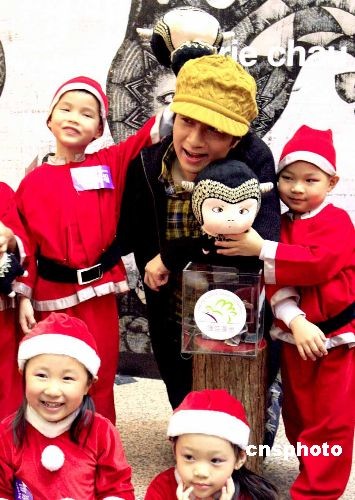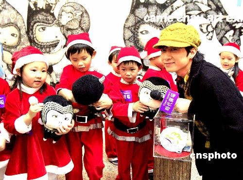 十二月一日,香港藝人古巨基與十位天真可愛的小小圣誕老人在時(shí)代廣場(chǎng)一起為護(hù)苗基金籌款。中新社發(fā) 張勤 攝