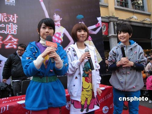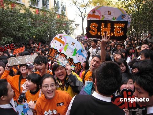 12月20日,臺(tái)灣人氣組合S.H.E在昆明為其新專輯《我的電臺(tái)FM S.H.E》舉行現(xiàn)場(chǎng)簽售活動(dòng)。盡管簽售活動(dòng)定于下午4點(diǎn)半開始,但熱情的歌迷中午12點(diǎn)就趕到現(xiàn)場(chǎng)排隊(duì)等候。S.H.E甫一出場(chǎng),即引來現(xiàn)場(chǎng)兩千多名歌迷的瘋狂尖叫。中新社發(fā) 劉子倩 攝