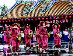 雖然下著大雨,但客家鄉(xiāng)親熱情依舊,個個打上客家花布領(lǐng)巾,組成客家味十足的踩街隊伍,由縣長領(lǐng)軍,從冬山鄉(xiāng)街道開始踩街至大興振安宮。