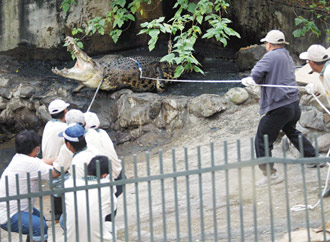 由于無(wú)人敢接近河口鱷,保育員采繩索硬拖拉法,八名保育大漢像拔河一般,將河口鱷硬拉進(jìn)長(zhǎng)鐵籠內(nèi)。隨后又以同樣模式,再硬拖重約一百三十公斤母鱷進(jìn)入另一鐵籠,以吊車先后安移入新居,與凱門鱷隔欄而居。