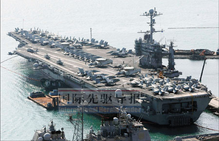 國(guó)際先驅(qū)導(dǎo)報(bào)特約撰稿海韜發(fā)自北京 “遲到”了近兩個(gè)月的美軍“華盛頓”號(hào)核動(dòng)力航空母艦,9月25日終于緩緩駛?cè)胄履父廴毡緳M須賀軍港。但僅僅6天之后,它就匆忙趕往韓國(guó)釜山,參加海上閱兵式;隨后,它還將南下東南亞,并于11月折回日本,主持美日海上聯(lián)合軍演。