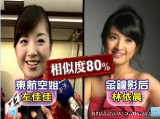身穿紅藍(lán)色旗袍,空姐們一字排開,她們都是參與直航包機(jī)、由航空公司精挑細(xì)選出的美麗代表,仔細(xì)看,一位笑容甜美的空姐是不是很像誰呢?東航空姐左佳佳說,乘客說她長得像林依晨,她也覺得自己笑起來的樣子挺像的。其實(shí)左佳佳不只是笑容,她彎彎的眼睛,還有圓潤的臉型,跟林依晨至少有80%相似程度。
