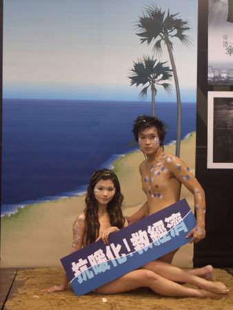 據(jù)“中央社”報(bào)道,記者會(huì)除了展示部分平面海報(bào)外,還請(qǐng)兩名大學(xué)生上演裸體真人海報(bào)秀,以“抗暖化、救經(jīng)濟(jì)”為口號(hào),扮演“海王子”拯救因海水溫度上升面臨生存危機(jī)的“美人魚”。