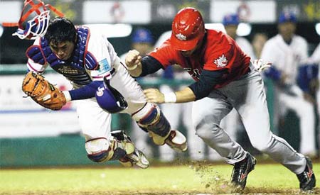 中新網(wǎng)3月11日電 北京奧運(yùn)棒球資格賽昨晚迎來中國(guó)臺(tái)北隊(duì)與加拿大隊(duì)之戰(zhàn),由于攸關(guān)兩隊(duì)名次,比賽過程充滿火藥味與緊張氣氛?上е袊(guó)臺(tái)北隊(duì)沒能守住最后關(guān)卡,九局上被加隊(duì)追平后,延長(zhǎng)賽十局上再失一分,終場(chǎng)以五比六吞下首敗。