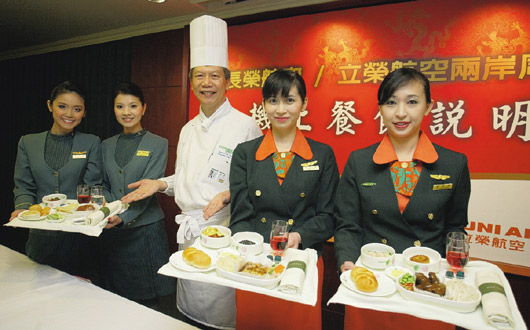 兩岸周末包機公司不只搶頭班機、比載客率,在餐點上也相互較勁。華航昨(1)日宣布商務艙將推出臺北故宮“晶華國寶宴”,圖中長榮、立榮則推出涵蓋兩岸各地的風味菜色。(臺灣《聯(lián)合報圖》)